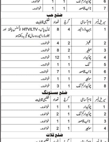 | 1 | ڈرائیور Driver | 04 | 1 | میٹرک پاس، HTV/LTV لائسنس یافتا اور لیفٹ ہینڈ ڈرائیور کا تجربہ رکھتا ہو |